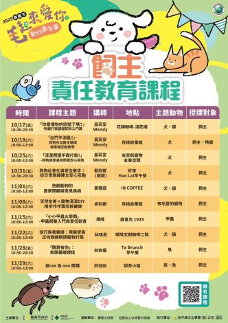 🐾【免費報名開跑|嘉義市飼主責任教育課程】🐾 你知道嗎?飼主的每一個選擇,都影響著毛孩的一生。 今年秋天,我們邀請你一起成為更有責任感、更有溫度的飼主 💛 📚 10堂課程 × 專業講師 × 實用主題 從犬貓行為、熟齡照護,到鳥類、鼠兔、甲蟲飼養知識, 還有外出禮...
