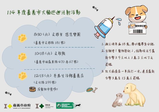 各位毛爸毛媽~ 下半年度的巡迴疫苗晶片注射來了 請大家把握機會唷,下半年2場的「免費」巡迴注射 10/18(六) 文財殿 10:00-12:00 12/13(六) 秀泰生活嘉義店 14:00-16:00 活動開始前十分鐘開始發放號碼牌,現場有寵物相關問題都可以詢問獸醫師...