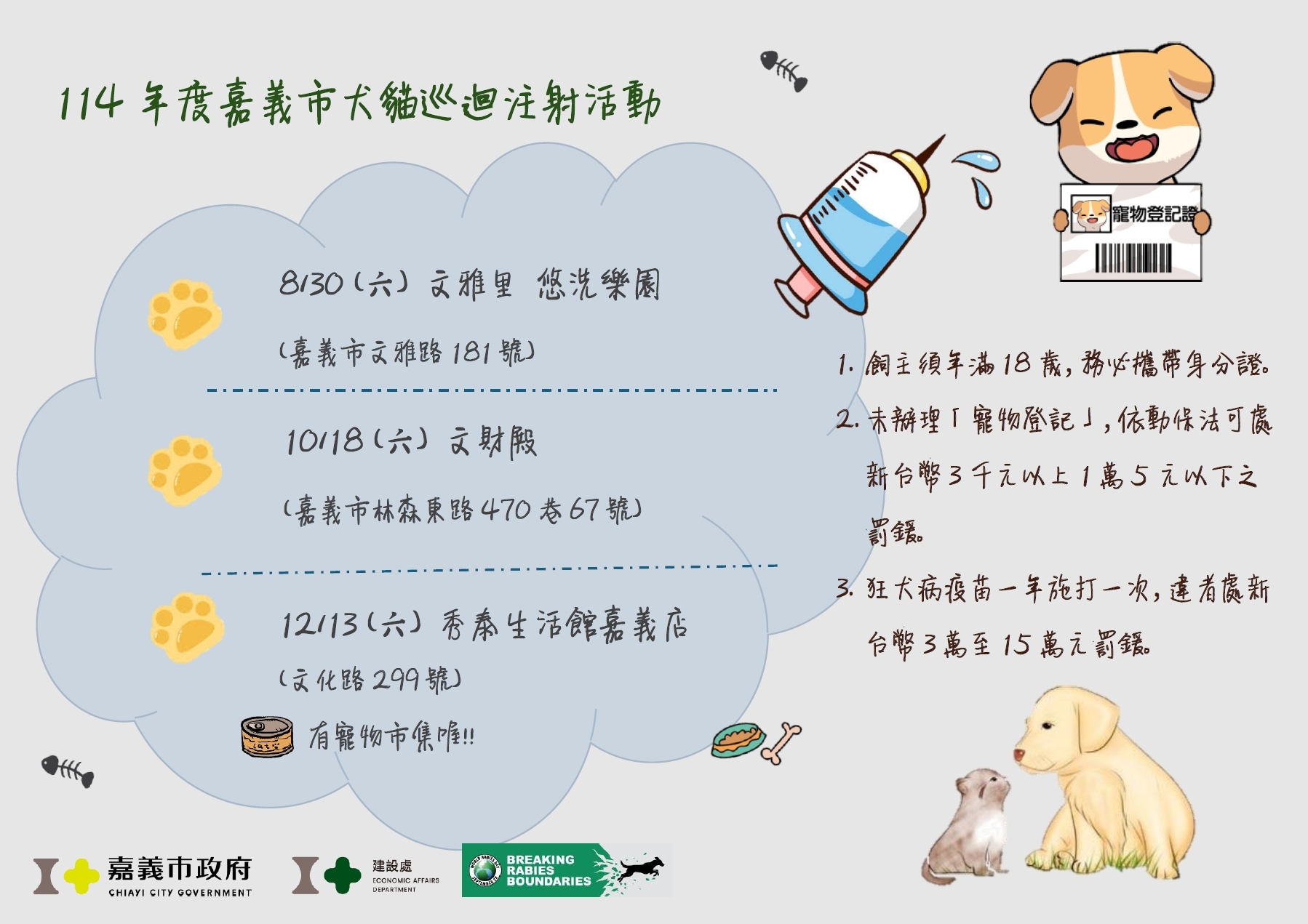 各位毛爸毛媽~ 下半年度的巡迴疫苗晶片注射來了 請大家把握機會唷,下半年2場的「免費」巡迴注射 10/18(六) 文財殿 10:00-12:00 12/13(六) 秀泰生活嘉義店 14:00-16:00 活動開始前十分鐘開始發放號碼牌,現場有寵物相關問題都可以詢問獸醫師喔 今年壓軸的一場,是與秀泰生活嘉義店合作,有好玩好逛的寵物市集,屆時帶著毛孩一起來唷! 愛牠就要保護牠,一定要帶毛小孩來打疫苗及晶片