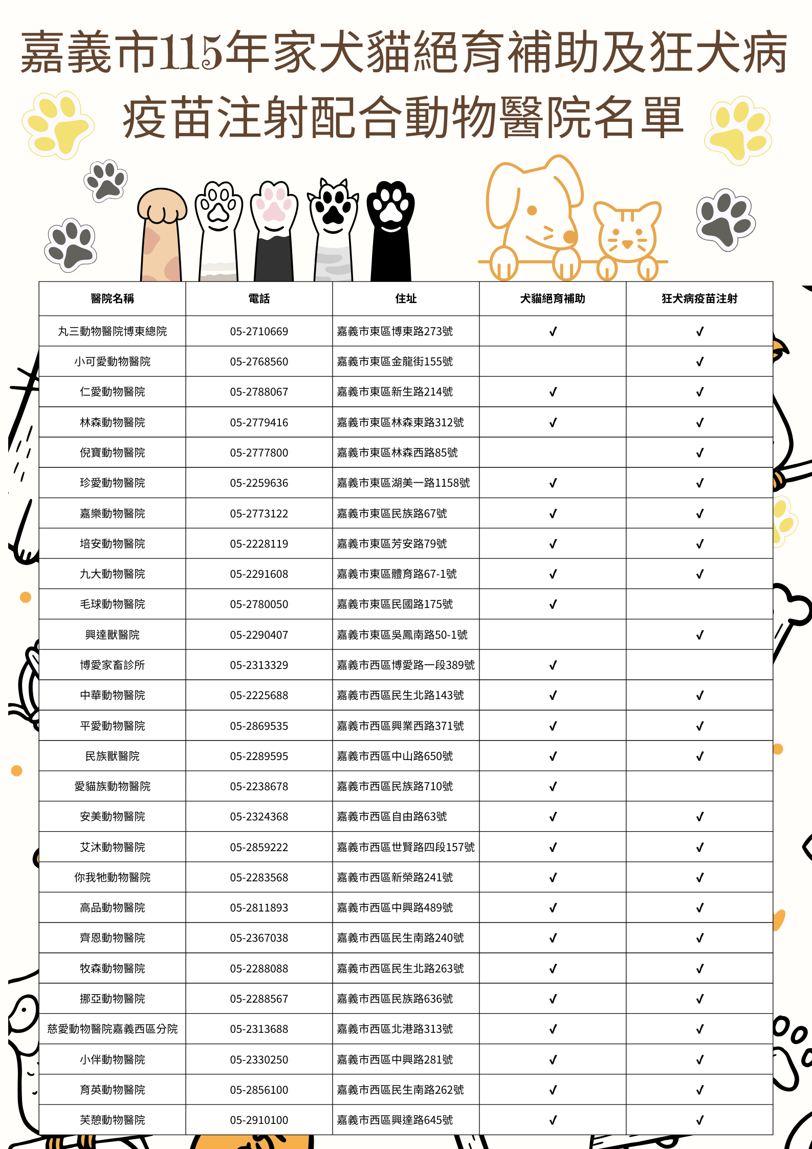 為打造更友善的動物城市,也幫飼主減輕飼養負擔,嘉義市政府自115年1月26日起至10月31日止(或經費用罄為止),同步推出「家犬貓絕育補助」及「犬貓狂犬病疫苗預防注射優惠」兩大措施,鼓勵市民落實寵物管理,守護毛孩健康,也提升公共安全。